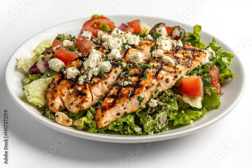 grilled, chicken, salad, lettuce, tomatoes, blue cheese, food, plate, healthy, meal, lunch, dinner, cookery, fresh, delicious, epicure, diet, nourishment, eatery, dish, protein, greener, vegetable, white background, culinary, cooked, grilled chicken, salad dressing