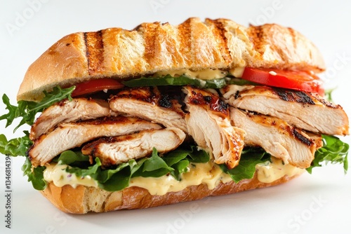 Grilled Chicken Sandwich on Fresh Bread with Tomato Arugula and Mustard Sauce on a White Background