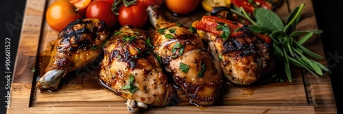 Grilled chicken served with fresh tomatoes and herbs on a wooden board, a perfect dish for a summer barbecue.