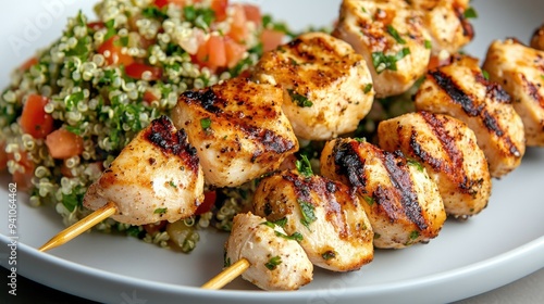 Grilled chicken skewers with a side of quinoa tabbouleh, showcasing a balanced and healthy dinner