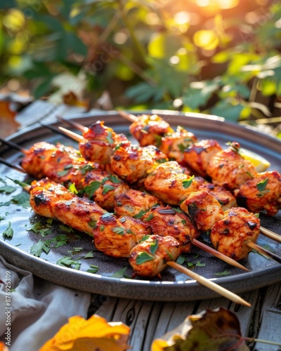 grilled, chicken, skewer, herb, plate, food, meat, dinner, spicey, seasoning, bar-b-q, delicious, cookout, fresh, summer, healthy, flavorful, protein, cookery, meal, tasty, hot, savoury, bar-b-q, photo, close, up, of, epicure, finger, cooking, receipe