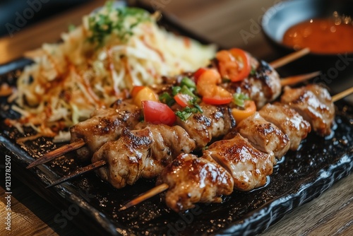 chicken, skewer, grilled, vegetable, salad, cabbage, plate, food, bar-b-q, dinner, closeup, epicure, protein, savoury, tender, roasted, colourful, juicy, traditional, homemade, herb, meal, vibrant, smoky, healthy, culinary, marinated, fresh, hearty, flavorful, appetising