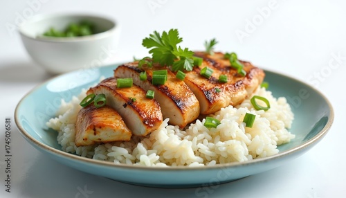 Grilled chicken slices rest on white rice, topped with fresh green onions, parsley. Healthy plate offers tasty, balanced lunch dinner. High protein meal good for diet, fitness plan, quick simple home