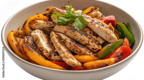 Grilled chicken strips and colorful sautéed vegetables served in a deep bowl, garnished with fresh cilantro for added flavor.