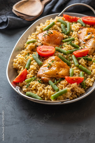 Grilled chicken thighs with bulgur, asparagus beans and tomatoes. Delicious lunch.