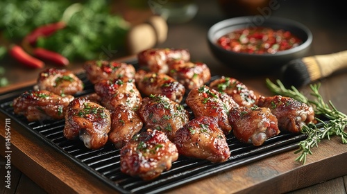 chicken, wing, grill, food, herb, spice, bar-b-q, cooking, favor, tasty, meal, cookery, garnish, smoky, crispy, savoury, delicious, platter, dining, receipe, feast, presentation, epicure, share, party, snack, seasoning, fresh, vibrant, culinary, roast, indulgent, juicy, tender, red, green, pepper, wood, rustic, sauce, dip, eat, heat