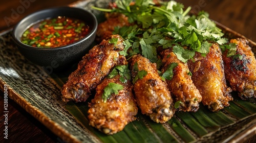 chicken, wing, grilled, spicey, sauce, dipping, cilantro, garnish, food, meal, dish, cookery, asian, thai, eatery, delicious, tasty, flavorful, hot, savoury, crispy, crunchy, brown, orange, red, green, leaf, plate, dark, background, wooden, texture, aroma, pepper, chili, coriander, banquet, eat, dinner, lunch, presentation, tempting, favor