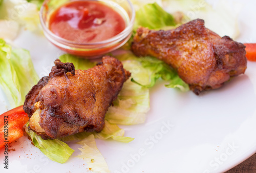 ketchup, food, chicken, lunch, sauce, dinner, meal, meat, unhealthy, fried, cookery, spicey, eat, grilled, fresh, eatery, tasty, delicious, hot, bar-b-q, closeup, crispy, wing, fast, plate, crust, salad, diet, broiled, nourishment, marinated, snack, skin, american, black, pepper, slice, nobody, dish, roast, thai, dinner, spice, red, leg, roasted, leaf
