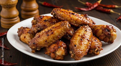 plate, eat, food, pepper, cook, delicious, bar-b-q, glaze, poultry, dinner, lunch, spicey, meat, fried, brown, grill, table, wood, closeup, white, red, favor, portion, sauce, dish, eatery, nourishment, fresh, ingredient, meal, studio shot, epicure, receipe, cookery, overhead, party, tasty, hot, snack, cookery, cooked, savoury, wing