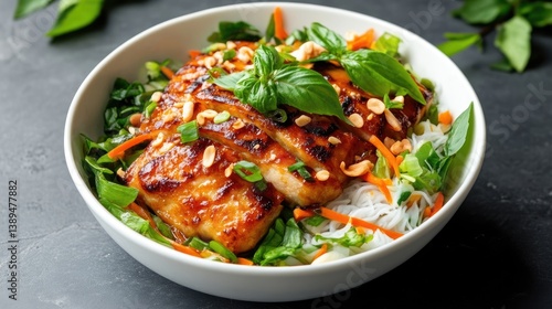 Grilled chicken with vermicelli noodles and vegetables. A flavorful, healthy bowl of stir-fried chicken, rice noodles, and fresh herbs. Topped with crunchy peanuts