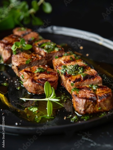 Grilled dish drizzled with olive oil and oregano, presented artistically to highlight Mediterranean flavors.