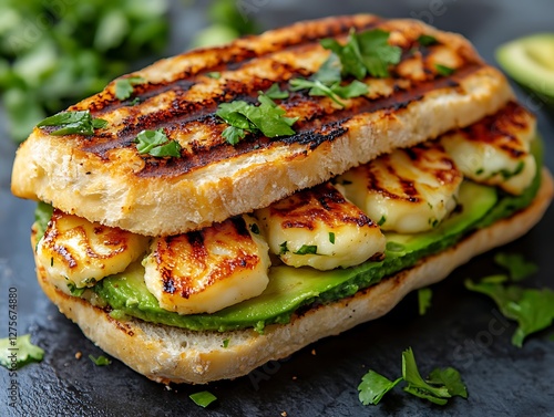 Grilled Feta Sandwich with Avocado on Dark Stone