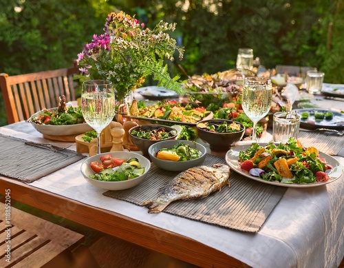 grilled fish, salad, health food, fresh food, food, table setting, dining table, garden, summer, celebration, gathering, friends, family, lifestyle, meal, cookery, delicious, epicure, catering, healthy lifestyle