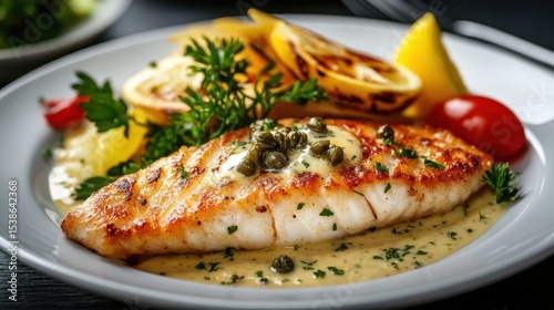 Grilled fish fillet served with creamy sauce, lemon wedge, herbs, and roasted potatoes on a white plate.