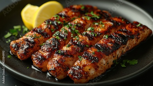 Grilled fish fillets, seasoned and glistening. Freshly grilled fish pieces, with a flavorful crust and a hint of lemon. Appetizing, flavorful, and ready to eat