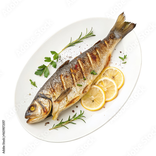 Grilled Fish Plate Single Sea Bass, Lemon, Herbs, Isolated on Transparent Background, seafood, grilled fish, food photography