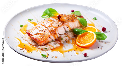 Grilled fish steak with orange sauce, gravy sauce, food, looks delicious, dicut, PNG file, isolated background.