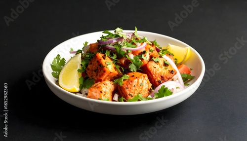Grilled fish tikka salad with marinated salmon cubes, fresh coriander, sliced red onion, and lemon wedges served on a white plate