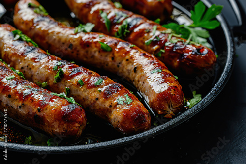 Grilled juicy sausages on a grill with fire. Shallow depth of field. Photos and menus of cafes and restaurants