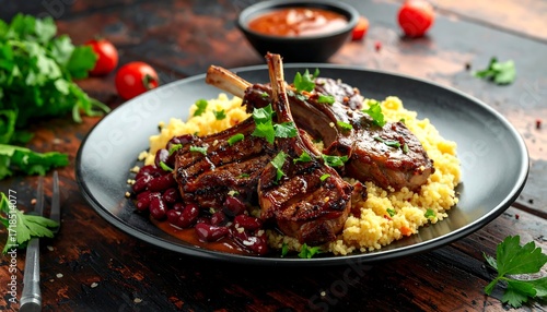 lamb, chop, couscous, bean, sauce, herb, plate, food, dinner, meal, grilled, cooked, dish, tasty, healthy, protein, dinnerware, wooden, table, appetising