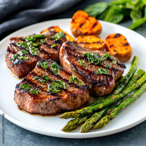 Grilled lamb shoulder chops served with asparagus and sweet potatoes, garnished with fresh herbs, create delicious and vibrant meal