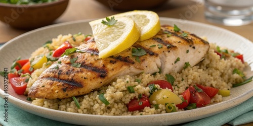 Grilled lemon herb chicken breast served over a colorful quinoa pilaf