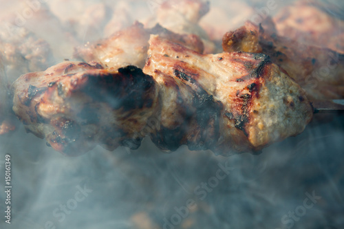 Grilled Marinated Caucasus Barbecue Meat Shashlik Shish Kebab Pork Meat Grilling On Metal Skewer. Nobody