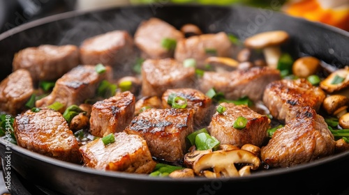 pork meat, grilling, marinated, close, up, frying pan, mushroom, green onion, food, cooking, meal, cookery, broth, lunch, dinner, preparation, fresh, smoke, surface, favor, tender, bar-b-q, kitchen, receipe, heat, steam, epicure, dish, savoury, ingredient, slice, juicy, meat, delightful, sizzling, vegetable, closeup, stalk, aroma, plate, grill, chef, delicious, frying