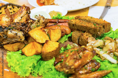 meat, salad, epicure, bread, eatery, food, grilled, meal, baked, bar-b-q, slice, unhealthy, chicken, cookery, lunch, people, table, cheese, potato, delicious, fresh, fried, green, red, sauce, asian, personal, wood, beef, menu, pot, potato, wooden, lamb, cutting, steak, dinning, fast food, board, set, sausage