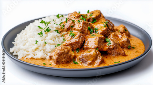 Grilled meat beef stroganoff with rice close-up on a plate. Isolated over white background