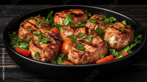 Grilled meat medallions garnished with fresh herbs and cherry tomatoes served in a black dish.