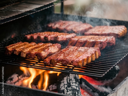 Grilled meat sizzling on a barbecue, infused with smoky flavors, creating a mouthwatering feast.