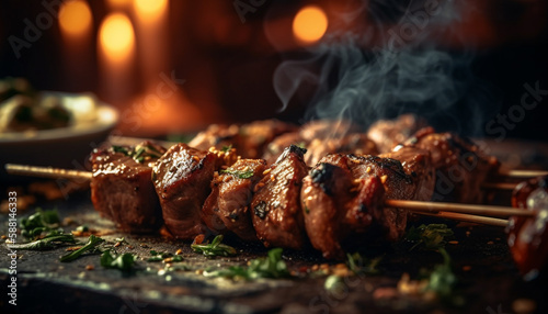food, meat, grilled, flames, bar-b-q, grill, fire, pork meat, heat, temperature, cooking, skewer, epicure, meal, coal, freshness, dark, beef, steak, lunch, smoke, plate, wood, material, spice, cooked, table, fat, burning, outdoors, snack, vegetable, marinated, rustic, glowing, slice, summer, picnic, party, generative, ai