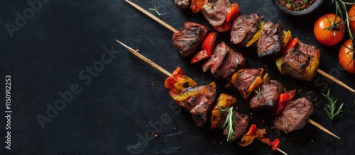 Grilled meat skewers with bell peppers and rosemary on dark background, featuring rustic and appetizing presentation.