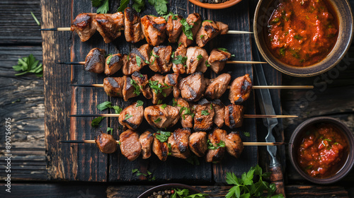 Grilled meat skewers with garnishes and dipping sauces on a dark background.