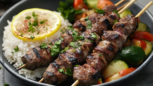 meat, skewer, grilled, rice, vegetable, courgette, tomatoes, lemon, parsley, dinner, food, cookery, meal, delicious, tasty, healthy, fresh, summer, bar-b-q, bar-b-q, protein, carb, side, dish, savoury, favor, photo, styling, gastronomy, culinary, cooking, receipe, kitchen, dining, eatery, art, plating, close, up