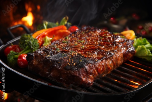 grilled meat steak and herbs and vegetables cooked on fire as a barbecue, delicious food