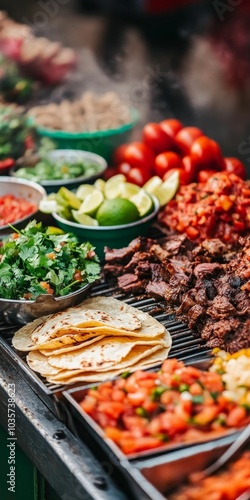 Grilled meat, tortillas, and toppings for tacos.