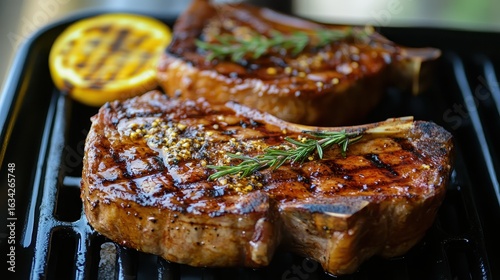Grilled Meat with Herbs and Lemon Slice on Black Grill Plate