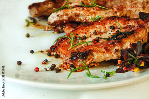 sliced, grilled, beef, bar-b-q, sirloin, stack, dark background, pepper, meat, meal, rosemary, fillet, fresh, beefsteak, steak, cooked, delicious, dinner, food, roasted, close, fork, plate, hot