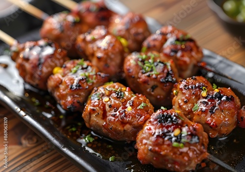 meatball, grilled, skewer, sauce, food, dinner, bar-b-q, meat, chicken, pork meat, beef, delicious, tasty, savoury, culinary, gastronomy, cookery, epicure, plate, wooden, table, background, close, up, detail, fresh
