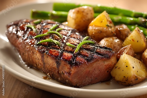 Grilled New York strip steak with roasted potatoes and asparagus on a plate, beautifully arranged for a mouthwatering food photography shot.