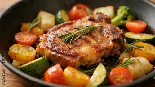pork chop, grilled, vegetable, frying pan, rosemary, tomatoes, courgette, onion, cooking, meal, food, healthy, dinner, herb, fresh, appetising, cookery, protein, side dish, meat, plate, dish, beef, chicken, pork meat, tomatoes, steak, salad, sauce, lunch, delicious, roasted, eatery, vegetable, epicure, fried, grill, tasty