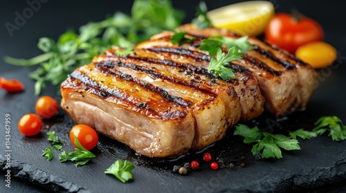 Grilled pork chops, garnished with herbs & cherry tomatoes. Perfect for menus, restaurant websites, or food blogs.