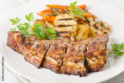 rib, bar-b-q, pork meat, bar-b-q, grilled, spare, meat, food, grill, dinner, cookery, meal, lunch, white, bar-b-q, cooked, plate, fried, roast, roasted, potato, vegetable, herb