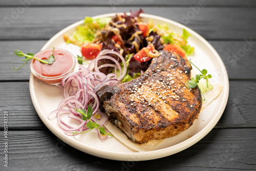 Grilled pork steak with vegetables and pickled onions in a plate on the table
