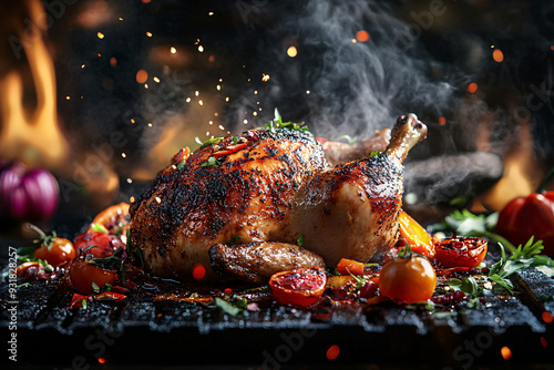 chicken, whole, cooked, dish, lemon, turkey, meat, view, top, food, dinner, bar-b-q, meal, background, thyme, table, receipe, christmas, poultry, crispy, black, seasoned, menu, homemade, up high, closeup, tasty, fork, lunch, beautiful, delicious, served, hot, wooden, epicure, brown, favor, knife, skin, holiday, rustic, cookery, baked, grilled, roasted, horizontal, rotisserie, main, nobody