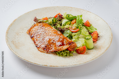 Grilled salmon fillet drizzled with sesame sauce, served alongside a vibrant garden salad