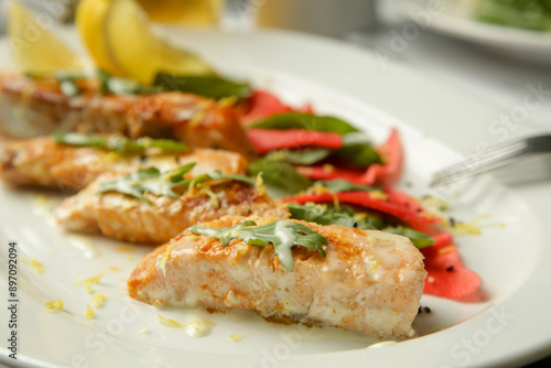 Grilled Salmon fillet with marinated vegetables served on the restaurant table