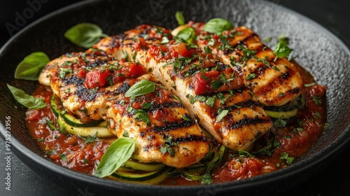salmon, grilled, courgette, tomatoes, sauce, herb, basil, plate, food, cookery, meal, dinner, healthy, epicure, cooking, receipe, vegetable, garnish, favor, nourishment, presentation, dish, dining, culinary, seafood, fresh, vibrant, delicious, appetising, organic, bar-b-q, grill, spice, seasoning, red, green, summer, serving, fork, knife, eatery, kitchen, chef, ingredient, platter, colours